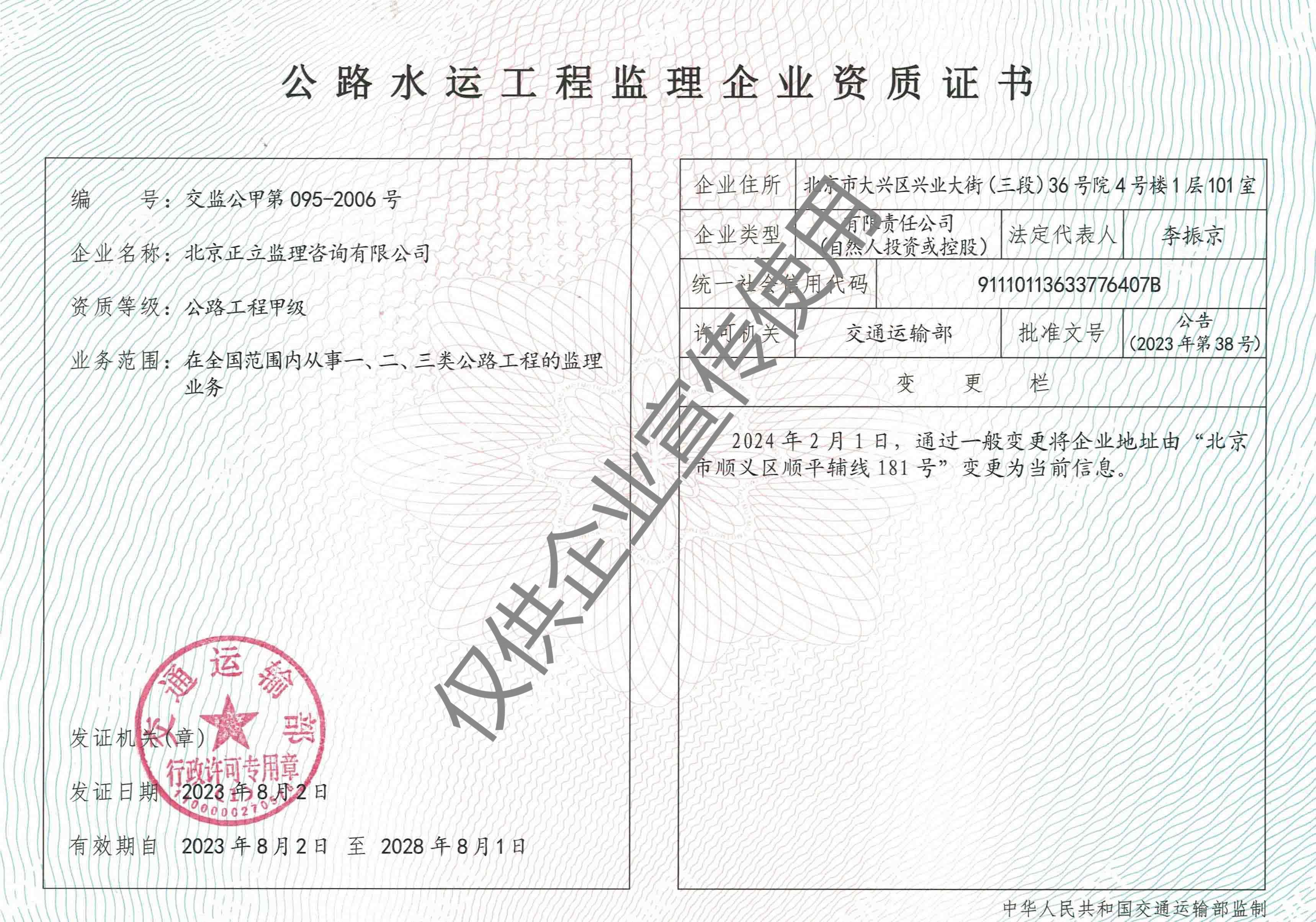公司現為中國交通建設監(jiān)理協會理事單位,持有交通運輸部公路工程甲級資質、房屋建筑工程乙級資質、市政公用工程乙級資質、綜合檢測乙級資質。能夠承擔高等級公路、大型橋梁、隧道工程、房建市政的施工監(jiān)理及技術咨詢服務。